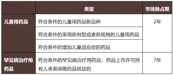 新《条例》第二十一条明确了国家支持儿童用药品、罕见病治疗用药品的研制和创新,通过对符合条件的药品给予一定时间的市场独占期来激励相关药品的研发与供应,我们将具体的适用类型和市场独占期期限总结如下: