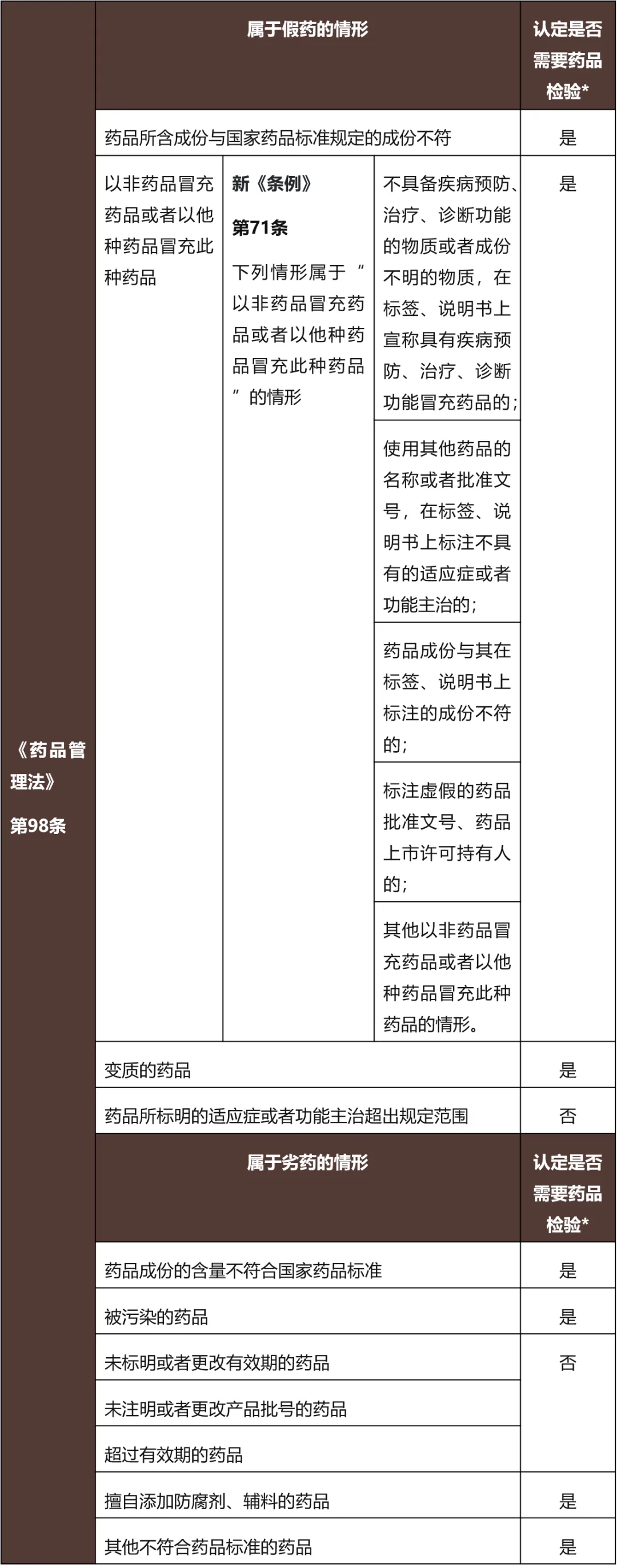 *注:除明确规定不需要进行药品检验的情况外,若原料、辅料的采购和使用记录等证据能够充分证明属于假药或者劣药的,可以不进行药品检验。