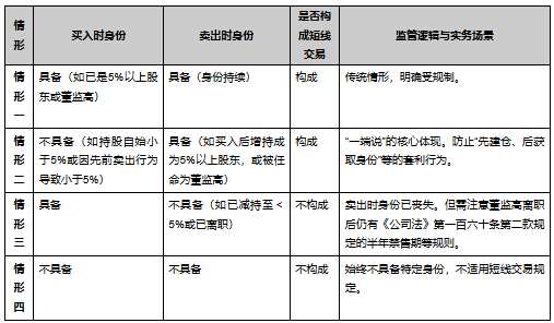 《规定》第四条明确规定,投资者买入时不具备特定身份,但卖出时具备的,应当遵守关于特定短线交易行为的规定。这标志着“一端说”在监管规则层面的正式确立。该原则的核心在于,短线交易行为的认定以“卖出”时点是否具备特定身份为关键标准。具体适用情形如下表所示: