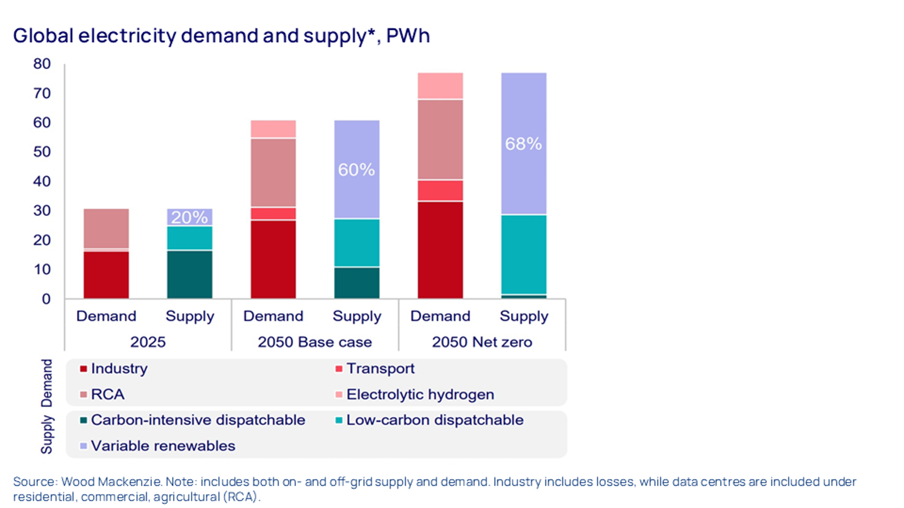 This comes from the executive summary for Wood Mackenzie’s 2025 Energy Transition Outlook, our flagship publication setting out our view of likely outcomes and possibilities over the next 35 years. The chart shows expectations for global electricity supply and demand in 2050: where the power will come from and how it will be used. One key point to notice: in our base case forecast, electricity demand is set to double over the next 25 years. In a world on course for net zero emissions, the growth would be even stronger.