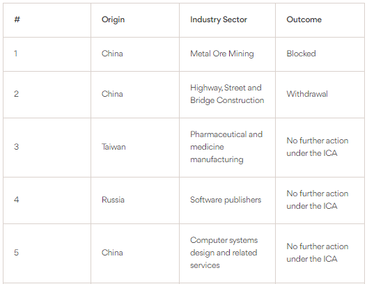In contrast to the overall decrease in ICA filings, the number of foreign investments subjected to national security reviews has continued to increase year-over-year. This trend is expected to continue as global investment activity increases, along with a sustained focus on security and critical infrastructure concerns highlighted by the pandemic.