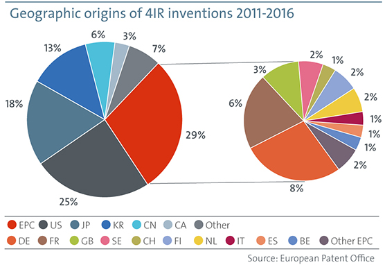 Listed among the 25 top applicants within the 4IR technologies are companies such as Samsung, LG, Sony, GE, Google, Apple and Toyota. This means that the patent applications originate from different parts of the world, where the Asian countries are clearly dominating with 37% of the applications originating from either Japan, South Korea or China, while 29% originate from European countries, and 25% from the US. In Europe the majority of applicants is based in Germany, France or Great Britain, but as clear evidence of the Swedish IoT revolution shows, Sweden positions itself in an honourable 4th place. The share of domestic inventions is for example 57% for Ericsson.
