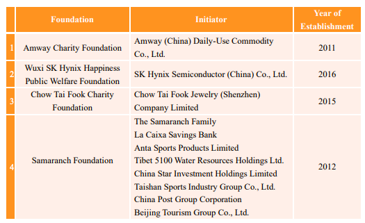 Foundations should be initiated with willing donations by natural persons, legal persons, or other organizations. Based on the principle of gratuitousness of public welfare donations, the initiator who established the foundation shall not claim rights from their invested property on the grounds of their contributions. A foundation is a donation-based legal person according to the Civil Code of the People’s Republic of China, which is equivalent to the “incorporated foundation” in the traditional civil law. The Chinese law requires certain minimum amount of the starting fund of a foundation. At present, the minimum amount of starting fund required for establishing a foundation is RMB 2 million. In China, foreign invested enterprises can also initiate and establish foundations. Below are examples of existing foundations established by foreign enterprises in China: