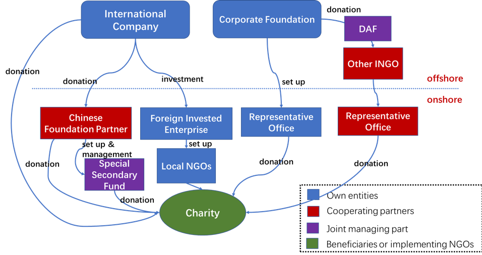 - Corporate foundations are often associated with business activities. Some enterprises carry out activities related to public welfare and charity activities in China with corporate foundations as their actual source of fund. Since corporate foundation and enterprise are two legal entities independent of each other, the activities conducted by corporate foundations in China should also meet the requirements of the PRC INGO Law. In practice, some corporate foundations without representative offices in China are currently maintaining their funding activities through other INGOs with representative offices established in China (e.g., United Way Worldwide, GlobalGiving, and Give2Aisa). Nevertheless, such practice is flawed in that the corporation foundation could not publicize its brand in China.
