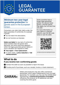 - A notice with a reminder about the legal guarantee of conformity and its main elements, including the minimum duration of two years. This notice must follow the template in Commission Implementing Regulation 2025/1960. There are different formats available for online and bricks-and-mortar sales. For example, for online sales, the notice must look like the one pictured below. For in-store sales, the notice can be in black and white, but must be at least A4 in size: