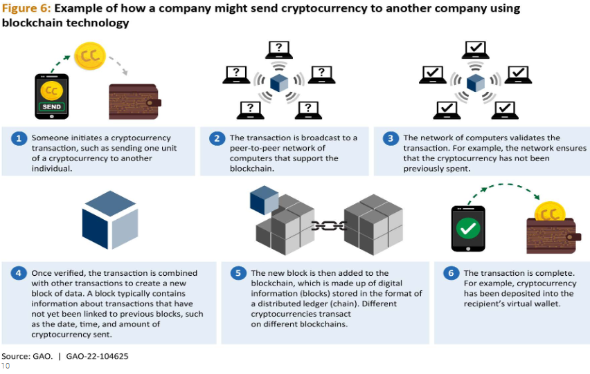 The best-known current use of distributed ledger technology is in the context of digital assets. While each type of digital asset may use distributed ledger technology in a different way, most digital assets are supported by distributed ledger technology. Below is a particularly useful, though somewhat simplified, illustration from the GAO on how a cryptocurrency transaction can occur through blockchain technology.