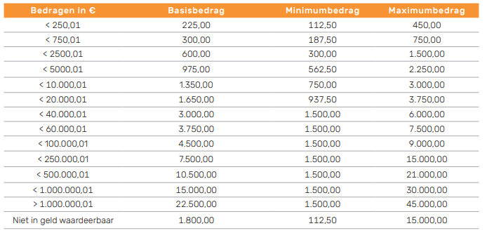 De wettelijke voorziene forfaitaire bedragen van de RPV zijn vastgelegd bij Koninklijk Besluit. De basis-, minimum- en maximumbedragen zijn onderworpen aan indexering telkens als het indexcijfer met 10 punten stijgt of daalt. Momenteel is er onduidelijkheid of de bedragen van de RPV sinds 1 maart 2023 met 10% gedaald zijn. Daarom blijven de bedragen van de rechtsplegingsvergoeding die gelden sinds 1 november 2022 voorlopig van kracht. Het overzicht vindt u hieronder:
