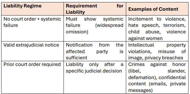 2. Extrajudicial Notification: Now accepted in other cases involving legally or constitutionally recognized rights violations (except crimes against honor—libel, slander, defamation—which still require a court order). A simple notification will suffice to trigger the platform’s duty to act. Failure to act may result in liability.