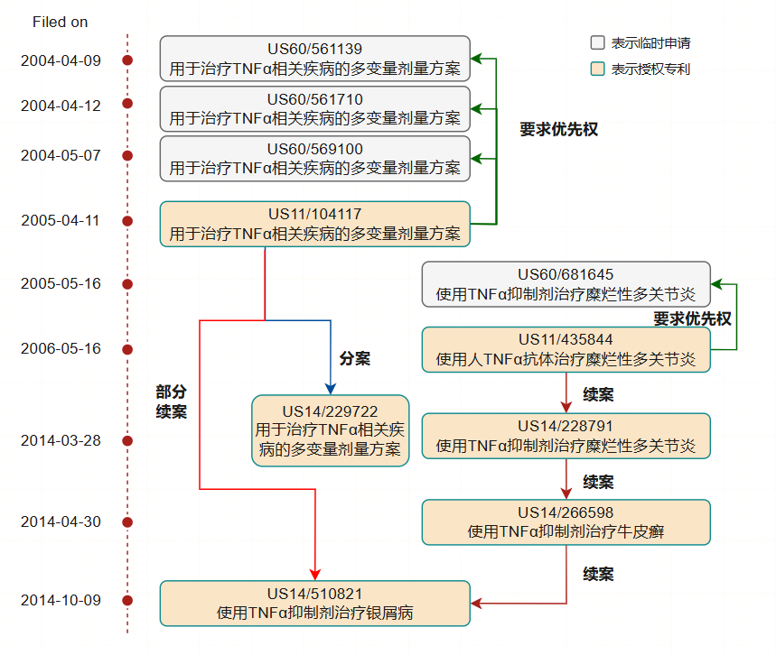 借助美国专利申请中的临时申请、续案申请、部分续案申请、分案申请等多种方式,申请人针对修美乐的新适应症与治疗剂量方案申请了多件专利,相关专利申请的时间跨度长达十年之久。以下将介绍上述四种申请方式的特点及其适用场景: