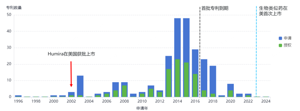 延缓阿达木单抗生物类似药上市时间,延续修美乐辉煌成就的背后离不开其专利布局策略。修美乐相关的美国专利申请共有276件,构成了一个庞大的“专利丛林”(patent thicket),其中95%以上的专利是在修美乐获批后递交的。如下图所示,首批专利于2016年到期,但在2014、2015年申请人仍在不断递交大量专利申请。早期的专利主要为抗体、抗体制剂、适应症的基础专利,后续申请的专利不仅包括有重大创新的药物配方、新适应症之类的专利,还包括大量的给药方法、制备方法、制剂剂量等外围专利。