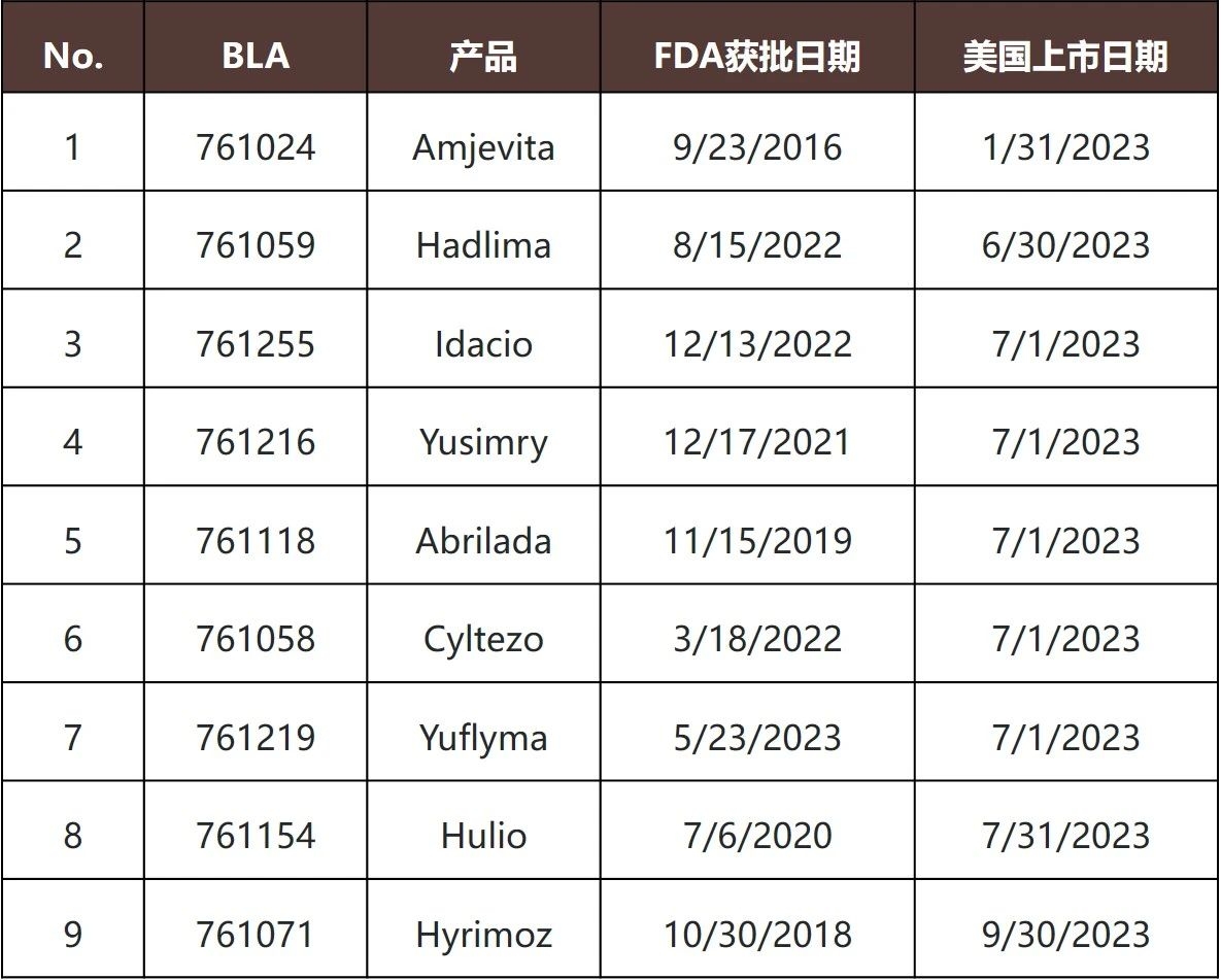 修美乐自2002年在美国首次上市以来商业成就极为亮眼。截至目前,修美乐的累计销售额已突破2300亿美元,曾多年蝉联全球药品销售额榜首。从市场增长轨迹来看,修美乐的全球年度销售额从2011年的79亿美元攀升至2022年的212亿美元的峰值,尽管2023年因仿制药进入美国市场导致其收入有所下滑,但仍实现了144.04亿美元的年度销售额。美国首个阿达木单抗生物类似药在2016年9月获批,于2023年1月正式上市,在此期间,修美乐的价格涨幅高达60%[1],带来了约1140亿美元的收入。下表为阿达木单抗生物类似药获批时间与上市时间的概览,其中许多类似药很早就获得了FDA(U.S. Food and Drug Administration,美国食品药品监督管理局)的批准,但都推迟至2023年才上市。
