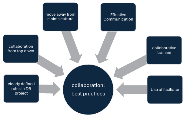In this summary, we have approached the collaboration conundrum from two distinct perspectives that emanated from our joint sessions. Consequently, this summary presents the working group’s findings and best practices in two parts: Practical Collaboration and Contractual Issues. First, we examine the practical considerations associated with collaboration on DB projects, the hindrances to collaboration, and the way that these issues can be addressed, at least in part, in the DB setting. Second, we have examined the role of the contract, including how better risk allocation can help to achieve better alignment. Proper risk allocation and contractual terms are essential to create an environment ripe for better and more fluid collaboration. However, if inconsistent, they can be a critical source of difficulty.