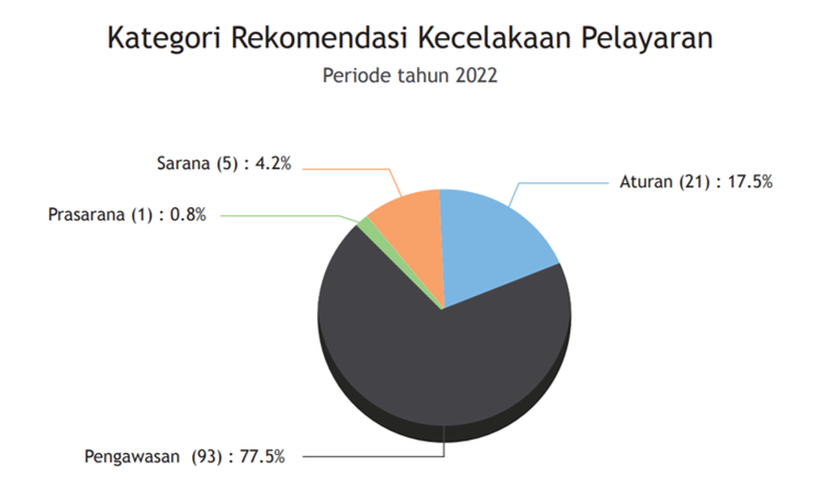 In 2022, KNKT investigation shows that shipping accidents is influenced by several causes such as technical issues, weather, and human factors. Technical factors are the most dominant cause of accidents from 2017 to 2021, with 39 accidents. However, the human factor is also one of the factors that is quite significant in causing accidents and totaled 35 accidents. The third cause is weather that affected ship accidents. [10] The majority of the recommendations given by the KNKT are related to supervision or control, with 39.6% of the total recommendations. The second most frequent recommendation related to facilities and infrastructure, with a high percentage of 29.9% of recommendations. The third is related to regulations, with a high of 27.4%. The pie chart below sets out the figures: