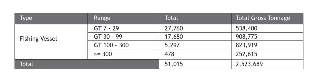 Based on the above, the highest number of vessels are fishing vessels followed by cargo vessels and passenger vessels. The tonnage of those vessels is varied that is detailed below: