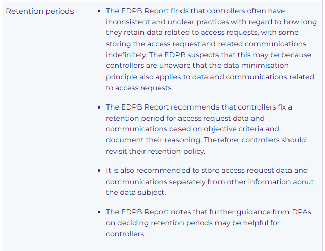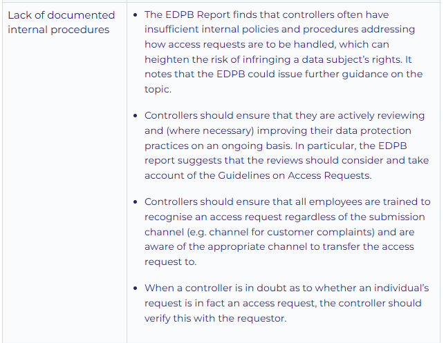 The EDPB Report on the right of access contains a plethora of recommendations for controllers on the handling of access requests. Controllers would be well advised to review their practices and policies related to access requests and to consider updating these to take account of the EDPB’s recommendations. The EDPB Report also recommends various updates to its Guidelines on Access Requests, for which controllers should keep an eye out.