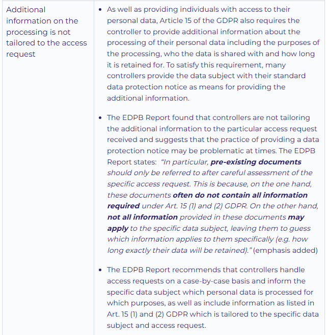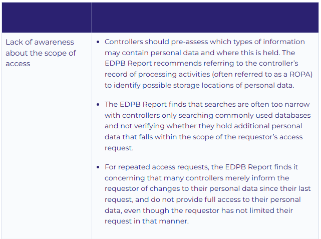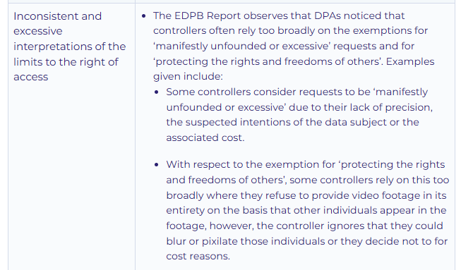 Earlier this year, the EDPB adopted a report on the implementation of the right of access by controllers, arising from the 2024 CEF action (the “EDPB Report”). The 2024 CEF action involved 1,185 controllers of varying size, industry and sectors. The EDPB Report provides useful recommendations for controllers on how to comply with the right of access. In particular, it recommends that controllers assess access requests on a case-by-case basis. The EDPB Report further observed that controllers were less aware of the content of the ‘EDPB Guidelines 01/2022 on data subject rights – Right of access’ (the “Guidelines on Access Requests”) which provide extensive guidance to controllers on implementing right of access and the various exemptions available.