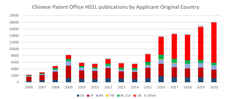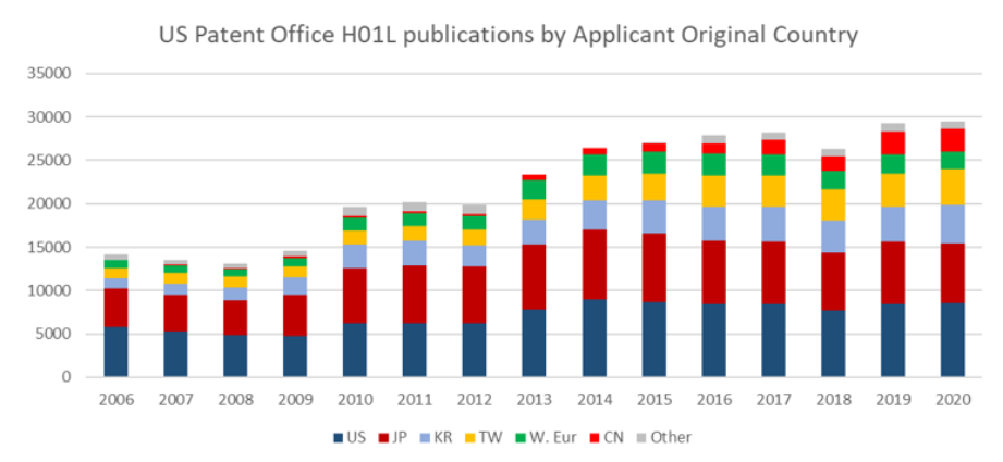 This methodology is subject to various types of imprecision. Publication year is of course a lagging indicator of invention, considering the years spent in prosecution. The H01L classification is a loose proxy for semiconductor-related patents, with the potential for false positives and negatives. The identification of applicant country can be misconstrued if a patent has applicants from multiple countries, or a corporate assignee headquartered in a country different than the inventor’s (applicant’s) country. Different patent offices and databases can categorize patents slightly differently. However, when comparing the overall results with output from another database, the trends shown for the three patent offices were generally consistent.