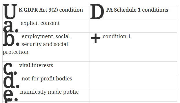 The UK GDPR requires a lawful basis to process personal data. It further prohibits processing special category data unless one of the 10 exceptions, referred to as ‘conditions’, apply (see table below).