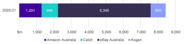 The ACCC report focusses on the four major online retail marketplaces in Australia, Amazon Australia, Catch, eBay Australia and Kogan. In 2020–21, they jointly had total of $8.4 billion in revenue, an increase of 21 per cent compared to 2019–20. See this bar chart: