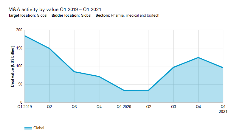 The global pharma, medical and biotech (PMB) sector saw US$95.4 billion in deal activity over the first quarter, almost three times the US$33 billion in deals announced in Q1 2020. Deal volume, meanwhile, increased 28% year on year, with 466 deals announced.