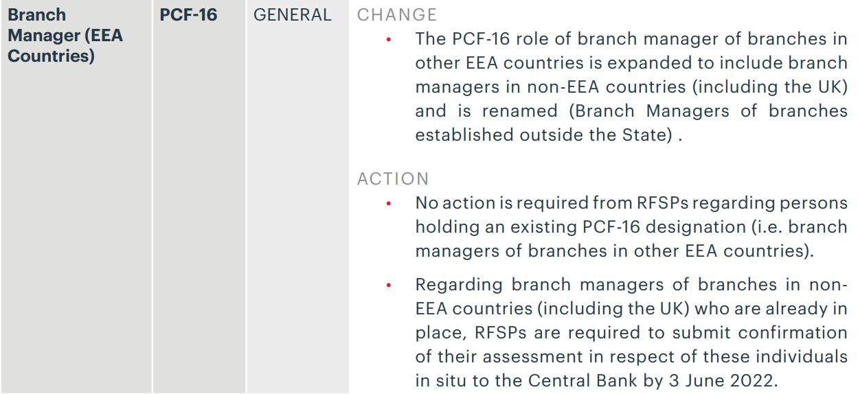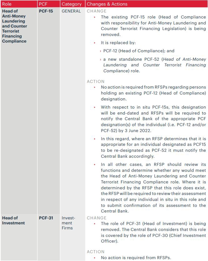 On 5 April 2022, the Central Bank of Ireland made further changes to its list of Pre-Approval Controlled Functions (PCFs) under its Fitness and Probity framework. These changes, introduced by amending regulations, are in addition to PCF role changes notified by the Central Bank in September 2022.