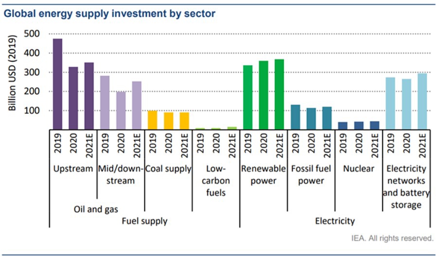 The above chart, obtained from the International Energy Agency (IEA), shows a decline in capital investment in traditional oil and gas sectors, and an increase of investment in renewable power and electricity networks and battery storage.