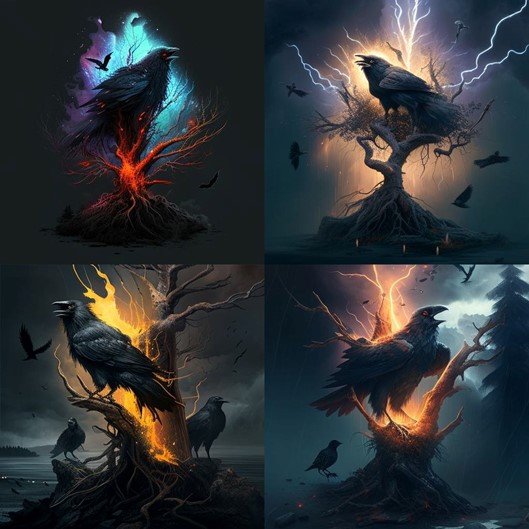For example, we entered the prompt “black lightning strikes a tree, while the world burns and two black ravens look on, so long and thanks for all the fish” into Midjourney[1]. The resulting four images were: