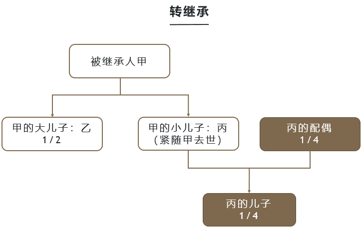 转继承的原理在于,继承是从被继承人死亡之时开始,因而如果被继承人死亡时继承人丙尚未身故,丙即有权取得对应的遗产份额(除非其嗣后放弃继承),只是需待分割完毕方能明确具体数额而已。因此,最终的结果应如下图: