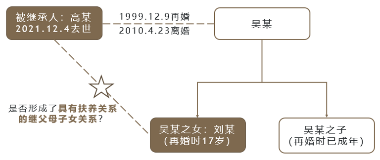 - 本案中,高某与吴某登记结婚时,刘某已年满17周岁且年龄已近成年,故结合在案证据及个案因素考量,本院认为刘某与高某并未形成有抚养关系的继父母子女关系,故刘某不具有高某法定继承人资格。