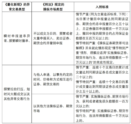由于操纵证券、期货市场罪是较典型的结果犯罪,结合《刑法》、《立案追诉标准二》、《最高人民法院、最高人民检察院关于办理操纵证券、期货市场刑事案件适用法律若干问题的解释》(“《操纵证券期货罪司法解释》”),量化交易刑事入罪和量刑客观标准为: