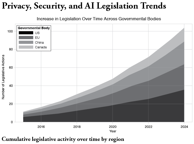 As of this writing, twenty US states have AI-specific laws passed or in the legislative development process, with little indication this trend will slow, and the European Union’s (EU) AI Act also has begun to take effect. If the aim is to use AI with personal data, compliance with the continued sprawl of privacy laws must be considered: twenty states now have comprehensive privacy laws, and global companies also must consider the EU’s Global Data Protection Regulation and numerous other international requirements. In the US, Canada, the EU, and China, laws related to data protection, cybersecurity, and AI have grown by 400 percent since 2016.