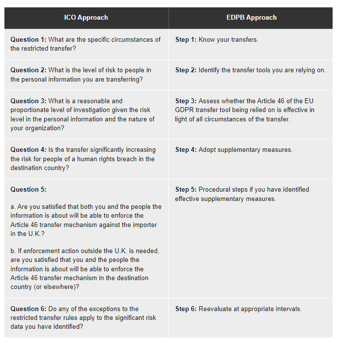 Additionally, the ICO TRA tool provides organizations with a pragmatic, user-friendly template containing a series of six broad questions (with step-by-step guidance, tables and sub-questions for each of these broad questions). By contrast, the EDPB does not offer organizations a template TRA. Instead, it provides comprehensive guidance on the six steps that organizations should follow when conducting a TRA (see “TRA Comparison Table” below).