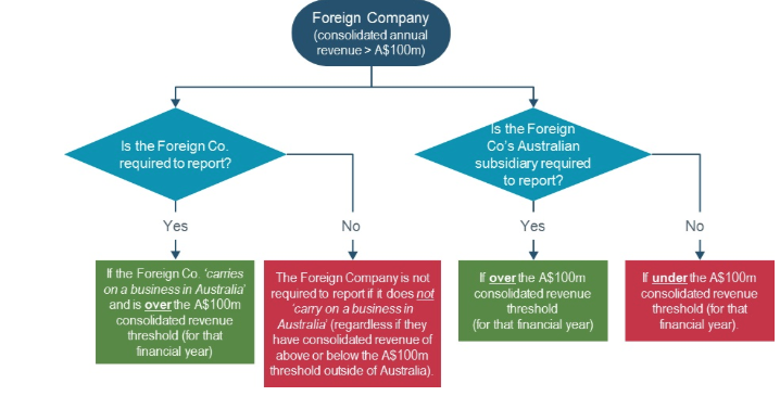 Diagram: when a Foreign Company and/or its Australian subsidiary are required to report.