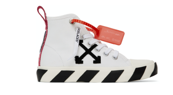 Although Glossier has an additional product packaging application pending at the USPTO, the pink pouch registration may be a source of hope for brands with pending applications for unconventional brand identifiers. For example, Virgil Abloh’s streetwear-meets-high fashion brand, Off-White, has been sparring with the USPTO since 2018 over its use of a red zip tie attached to footwear and apparel. The mark “consists of a zip tie with a substantially rectangular end, all in the color red.” Off-White claims the color red as part of the mark (serial no. 88,041,456). An example of the tag is pictured below: