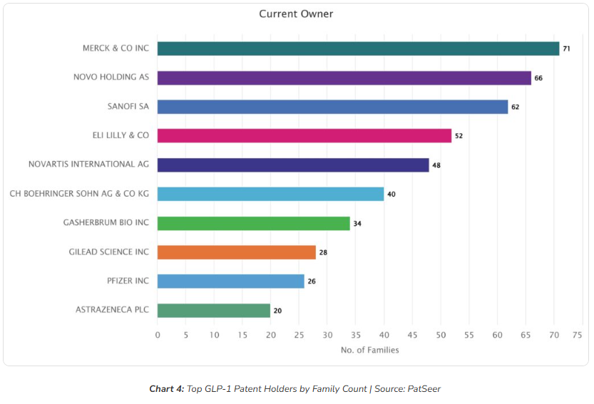While Novo Nordisk and Eli Lilly remain central from a commercial standpoint, the IP landscape shows a broader set of influential players. Merck & Co. emerges as a leading portfolio holder, highlighting how patent strength and market visibility do not always align.