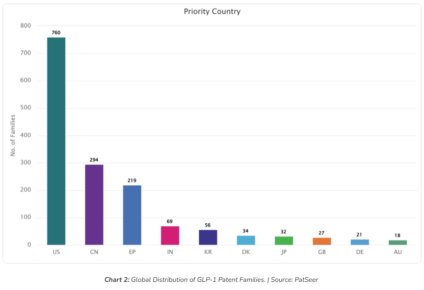 Chart 2 shows that the United States leads with 760 priority filings confirming its position as the primary arena for GLP-1 IP competition. This concentration reflects both the size of the American pharmaceutical market and the strategic importance of USPTO examination quality for downstream litigation.