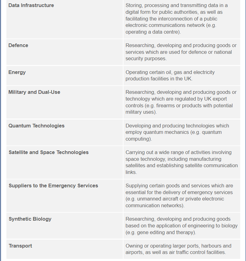 - the Target Risk – the nature of the target (what it does, is used for or could be used for) and whether it is in an area of the economy where the Government considers risks are more likely to arise;