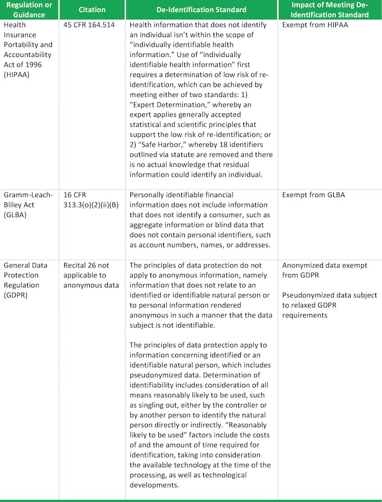 De-identification occurs when an individual’s identity is no longer ascertainable or the risk of identifying an individual is significantly low due to the removal of direct personal identifiers (e.g., a data subject’s first and last name) and indirect identifiers (phone numbers, email addresses, etc.). Regulatory requirements dictate whether a given de-identification standard has been met and the effect that meeting such standard has on the use of the remaining data set. Below is a summary of de-identification standards for two of the most prominent data protection statutes in the United States, HIPAA and GLBA, as compared against the de-identification standard under GDPR.