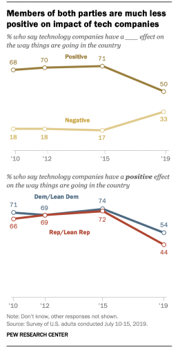 It was once close to a consensus view that the new technology companies were improving life. Now, it has become much more of an even proposition. The shift in views on technology companies has been pretty stark and bipartisan: