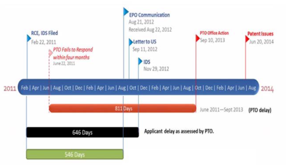 Supernus, the owner and assignee of the patent-at-issue, filed a Request for Continued Examination (“RCE”) on February 22, 2011 to remove the finality of a rejection during prosecution of U.S. Patent Application No 11/412,100 (“the ‘100 application”) and for consideration of additional information. On August 21, 2012, the EPO notified Supernus’ European Counsel that a Notice of Opposition was filed by Sandoz in an international application that claimed priority to the ‘100 application, and Supernus’ European Counsel informed Supernus of the EPO notification on September 11, 2012. On November 29, 2012—seventy-nine days after being informed or 100 days after the EPO notification of the Sandoz Opposition—Supernus submitted a supplemental IDS to the USPTO to inform them of the opposition and the documents submitted therein. After another round of prosecution, the USPTO issued a Notice of Allowance on February 4, 2014, and the ‘100 application issued as U.S. Patent No. 8,747,897 (“the ‘897 patent”) with a Patent Term Adjustment of 1,260 days.