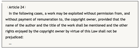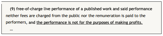 The current Copyright Law provides that “free-of-charge live performance of a published work, without the permission from and payment of remuneration to the copyright owner, is permitted when neither fees are charged from the public nor the remuneration is paid to the performers, provided that the name of the author is mentioned.”