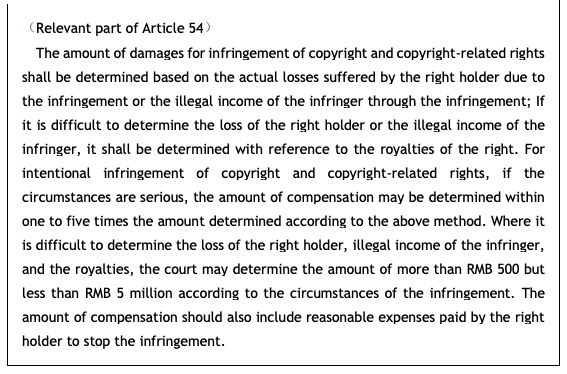 The amended Copyright Law provides a series of punishment measures to greatly increase the cost of infringement. For intentional infringement, if the circumstances are serious, punitive damages ranging from one to five times the amount of compensation may be applied. If the actual loss of the right holder, the illegal income of the infringer, and the royalties are difficult to calculate, the court shall, based on the circumstances of the infringement, award compensation of not less than RMB 500 but not more than RMB 5 million.