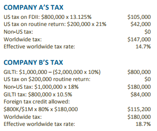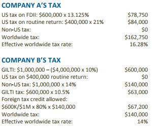 If, however, we change the two key variables, Company A pays more tax than Company B. For example, assume the same facts except that the tangible asset base is $4 million and the non-US tax rate is 14%. In that case, Company B would pay less worldwide tax than Company A.