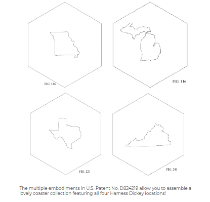 U.S. Patent No. D824219 issued on July 31, 2018 on a “Coaster State Bottle Opener.” This patent is interesting because it has 52 embodiments that are depicted in 260 Figures, featuring every state on its own coaster/bottle opener.