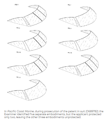 This was the case in Pacific Coast Marine Windshields Ltd. v. Malibu Boats, LLC, (Fed. Cir. 2014), where the Federal Circuit held that when subject matter is surrendered during prosecution of a design patent (such as by acceding to a restriction requirement), prosecution history estoppel prevents the patentee from “recapturing in an infringement action the very subject matter surrendered as a condition of receiving the patent.”