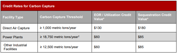 The Act extends the eligibility period for carbon capture projects to qualify for tax credits under Section 45Q for an additional seven years, increases the applicable credit rate, and substantially lowers the minimum capture thresholds for carbon capture projects to qualify for tax credits.