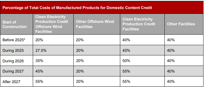 A project may qualify for the domestic content bonus if all of the steel, iron, and a minimum percentage of the manufactured products comprising the project were produced, mined, or manufactured in the US. The minimum domestic content percentage required for manufactured products increases over time and varies based on project type.