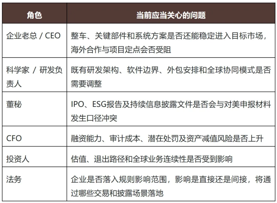 当然不同企业和不同岗位的关注点并不相同。对大部分企业老总而言,最直接的关切是整车、关键部件和系统方案是否还能稳定进入目标市场;对科学家和研发负责人而言,压力在于既有研发架构、软件边界、外包安排和全球协同模式是否会被迫调整;对董秘、CFO和投资人而言,需要重点关注的是IPO、融资和ESG披露中的供应链叙事,是否会与美国监管或美国客户要求提交的合规声明、软件清单和硬件清单发生口径冲突;而对法务团队来说,最先需要回答的则是:企业是否已经处在规则影响范围内,这种影响是直接的还是间接的,又将通过哪些交易、客户和披露场景具体落地。
