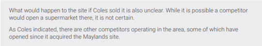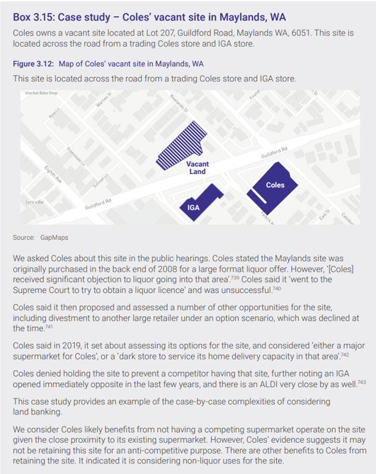 We have not conducted this case-by-case assessment as part of this inquiry. Given the confines of the inquiry, we also did not observe Coles and Woolworths engaging in a deliberate or overarching strategy of land banking.” [p 160-161]