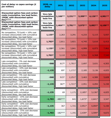 This table displays the discounted delay costs for carbon and option fees in cumulative terms, for the 19GW of planned offshore wind capacity included in the HND. Such delay costs included the Crown Estate option fees (with the risk that such fee costs would be recovered by the generator through higher Contracts for Difference (“CfD”) strike prices, and could effectively be passed through to electricity consumers, as CfD subsidies are funded by a levy on end user bills) and the ‘carbon costs’ of delaying renewable energy generation beyond 2030. Ofgem has estimated that the costly delays avoided by the very late competition model outweigh the potential capex savings provided by the other competition models.